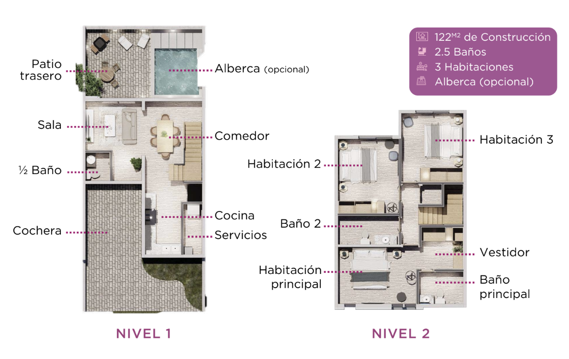 Alberca Área de juegos infantiles Pet park Área social techada Áreas verdes *Los precios pueden cambiar sin previo aviso.