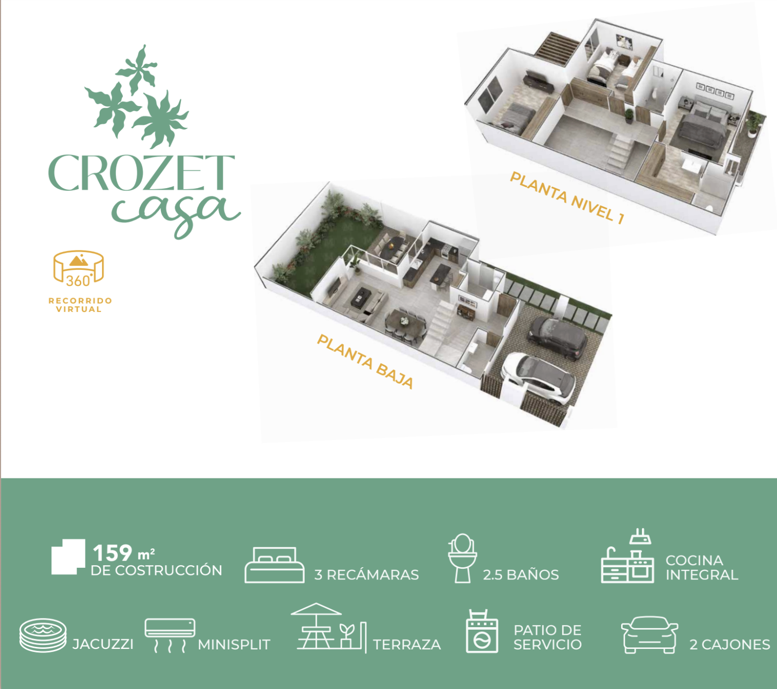 4,405,000 Casa Crozet - Aukena 4 Casa Crozet está dentro de Aukena es un desarrollo residencial moderno y bien planeado, pensado para quienes buscan una vida cómoda, práctica y bien conectada, muy cerca de todo: a solo 10 minutos de la playa, la Quinta Avenida y el ferry a Cozumel, además de tener rápida conexión con plazas comerciales, hospitales, bancos, gimnasios, escuelas y restaurantes Podrás disfrutar de las amenidades del Sport Club, donde encuentras: alberca, gimnasio, social lounge, salón de juegos, pet park, canchas de pádel, básquetbol, fútbol y tenis, además de ludoteca, juegos infantiles y área de coworking CASA CROZET Esta casa es de 2 niveles, 3 recámaras, 2.5 baños, patio... Y lo mejor de todo con jacuzzi privado Planta baja -Cocina integral -Baño -Área de sala -Área de comedor doble altura -Patio con jacuzzi -2 estacionamientos Planta alta -2 recámaras secundarias -Baño -1 recámara principal con vestidor, baño y terraza Y está desde 4,405,000 mxn Precio de promoción febrero desde 4,330,000 mxn Las casas se distribuyen en privadas, y cada privada cuenta además con alberca, área social, asadores y espacios para convivir Por su ubicación, diseño y amenidades, Aukena no solo es una excelente opción para vivir, también es atractiva para la renta vacacional o de mediano plazo, con demanda constante